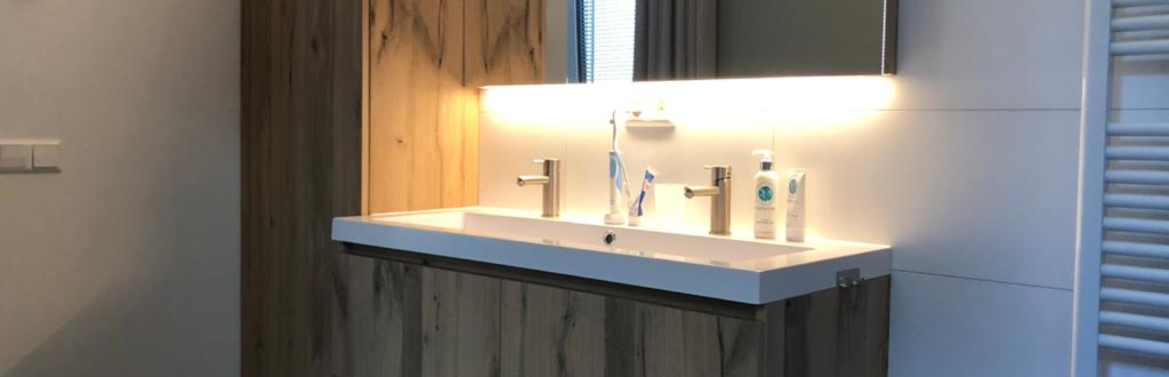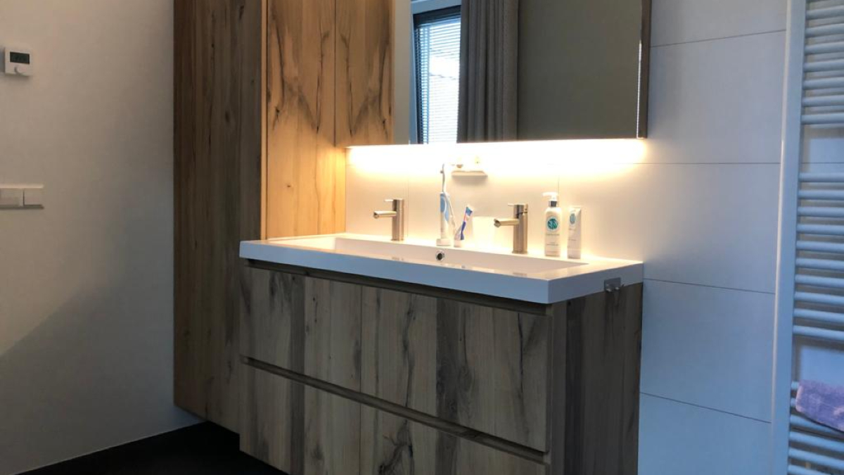 Nooit meer voordringen bij het tandenpoetsen, want de wasbak biedt voldoende ruimte voor twee! De grote rechthoekige spiegel die erboven hangt is voorzien van backlight LED-verlichting.