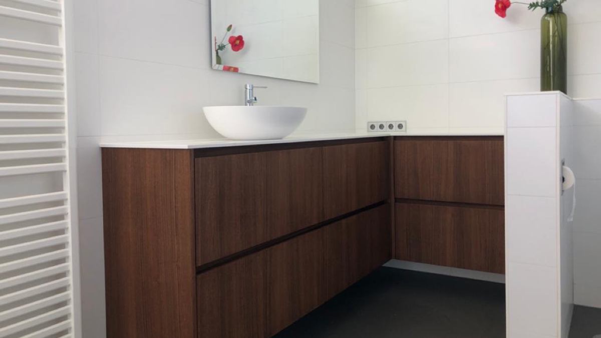 Het lijkt niet de meest logische keuze, maar het kan heel goed. Doordat wij dit in notenhout uitgevoerd wasmeubel behandelen, blijft het beschermd tegen vocht.