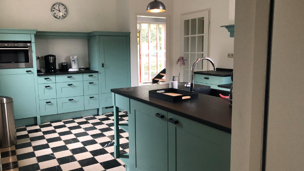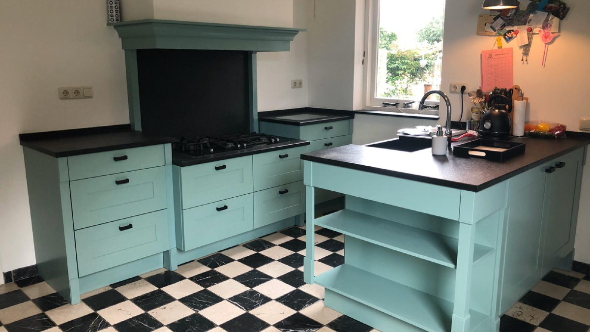 Wij demonteerden de keukendeurtjes, scharnieren en handgrepen vervingen we voor nieuwe. In onze werkplaats spoten we de deurtjes en lades in de kleur blauw met zijdeglans afwerklaag. En wat pakte dat goed uit zeg! De kleur van de keuken steekt lekker af tegen de zwart-wit geblokte vloer. Het verleent deze landelijke keuken zoveel sfeer en karakter.