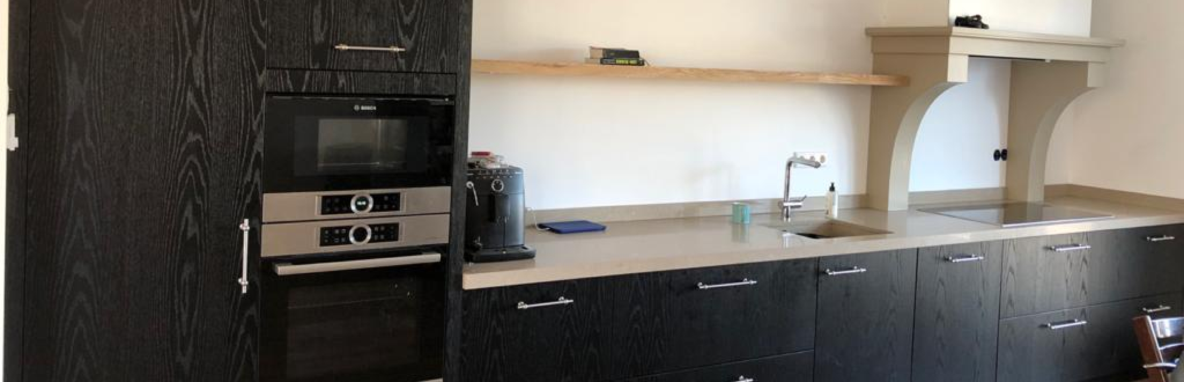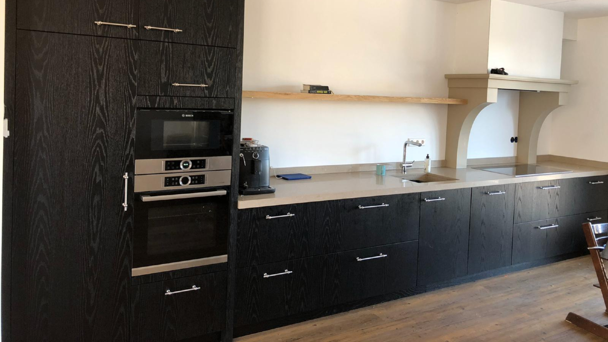 Deze rechte keuken in eiken fineer is gespoten in de kleur RAL9005 en bestaat uit twee hoge kasten waarin de koelvriescombinatie, een oven en combimagnetron zijn weggewerkt.
