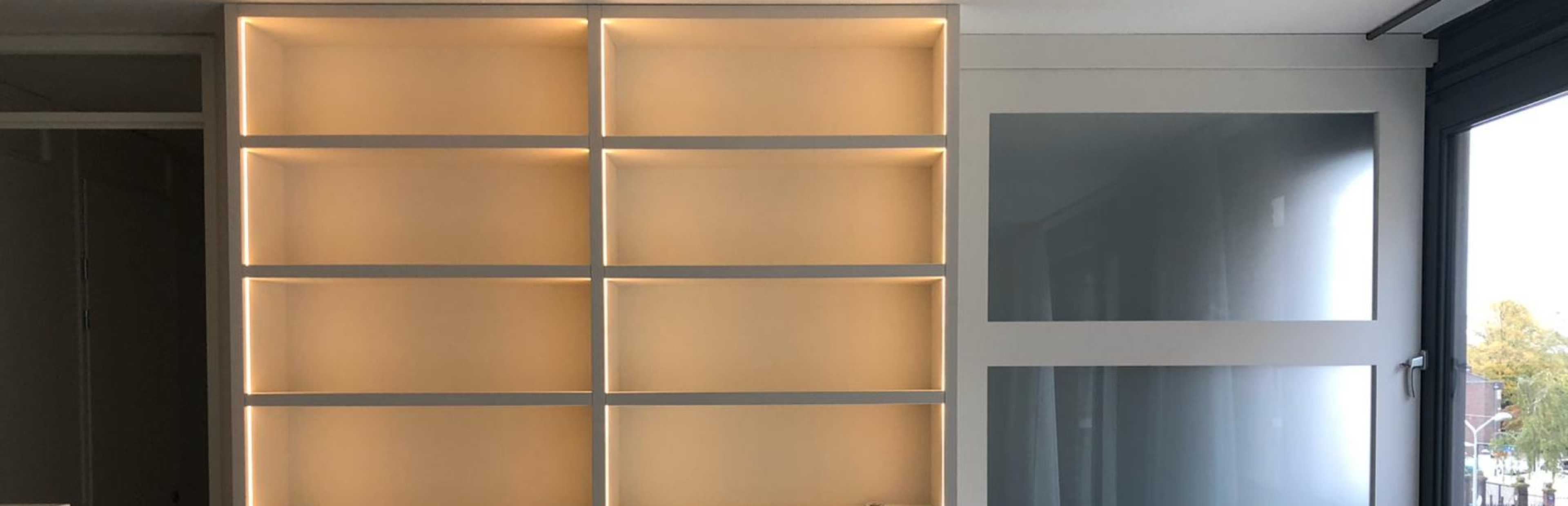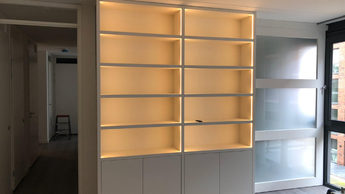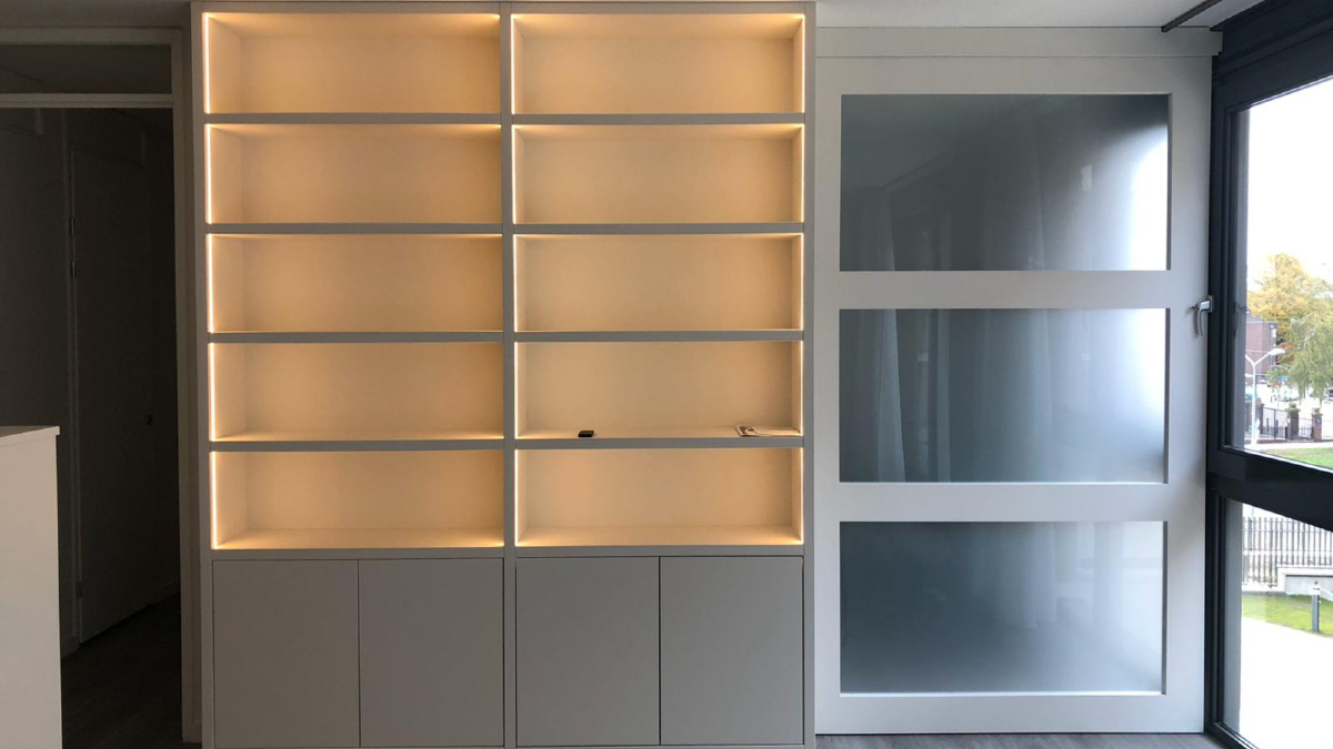 De op maat gemaakte boekenkast heeft een strak uiterlijk, waarbij de vakken zijn voorzien van sfeerverlichting. De ondekant van de kast biedt de ruimte om op te bergen achter gesloten deuren.