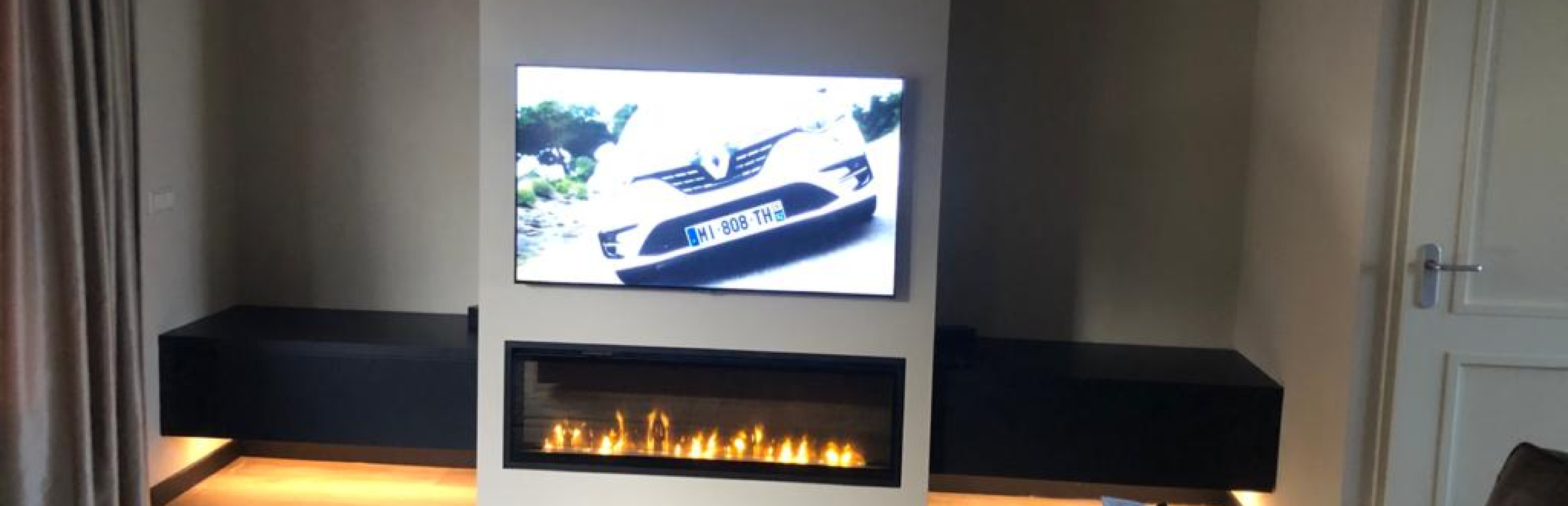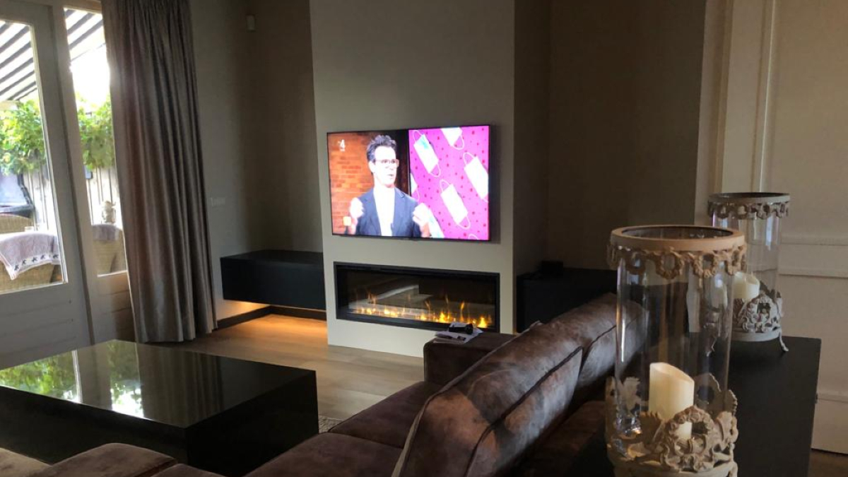 De televisie en sfeerhaard integreerden wij in de schouw. Links en rechts daarvan plaatsten wij het wandmeubel met klepkast in zwart eiken. En om de juiste sfeer te creëren plaatsten we de verlichting onder het meubel.